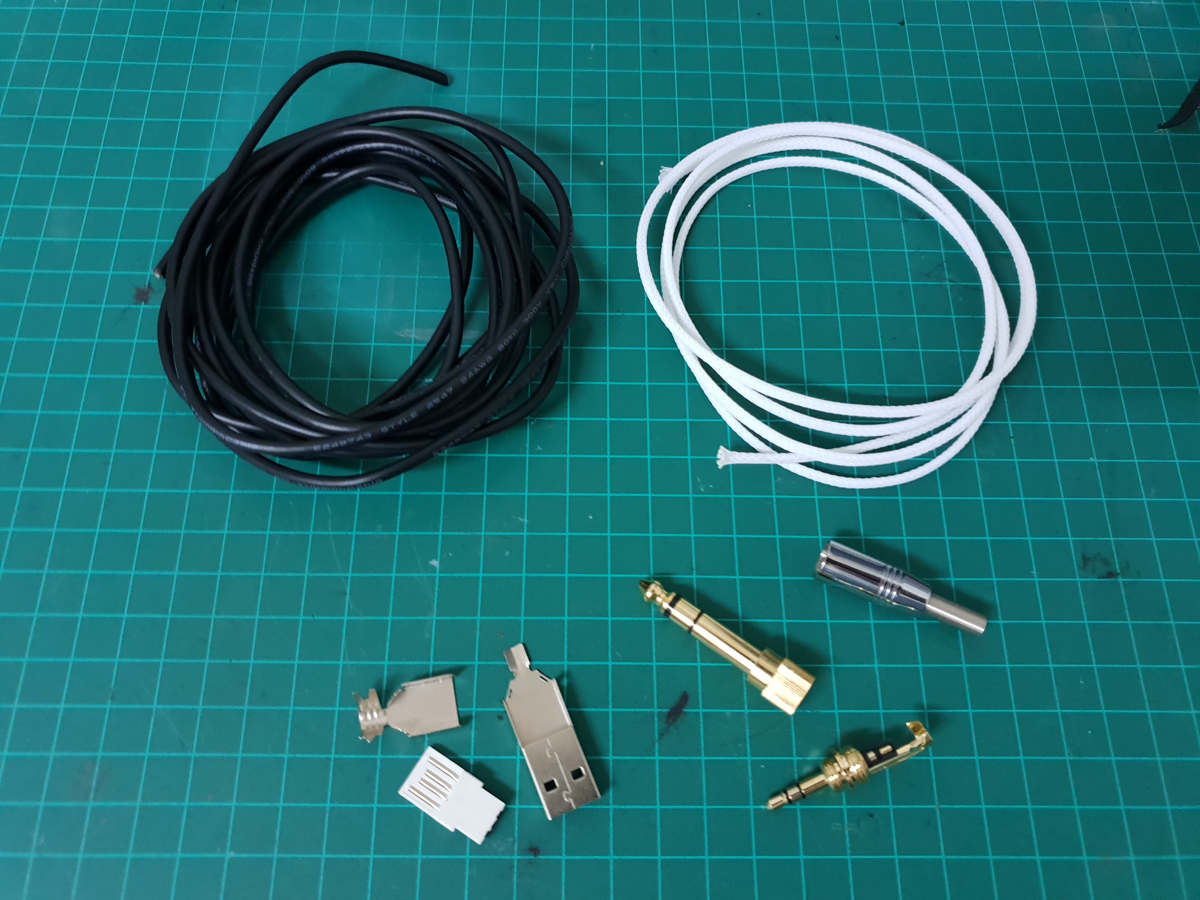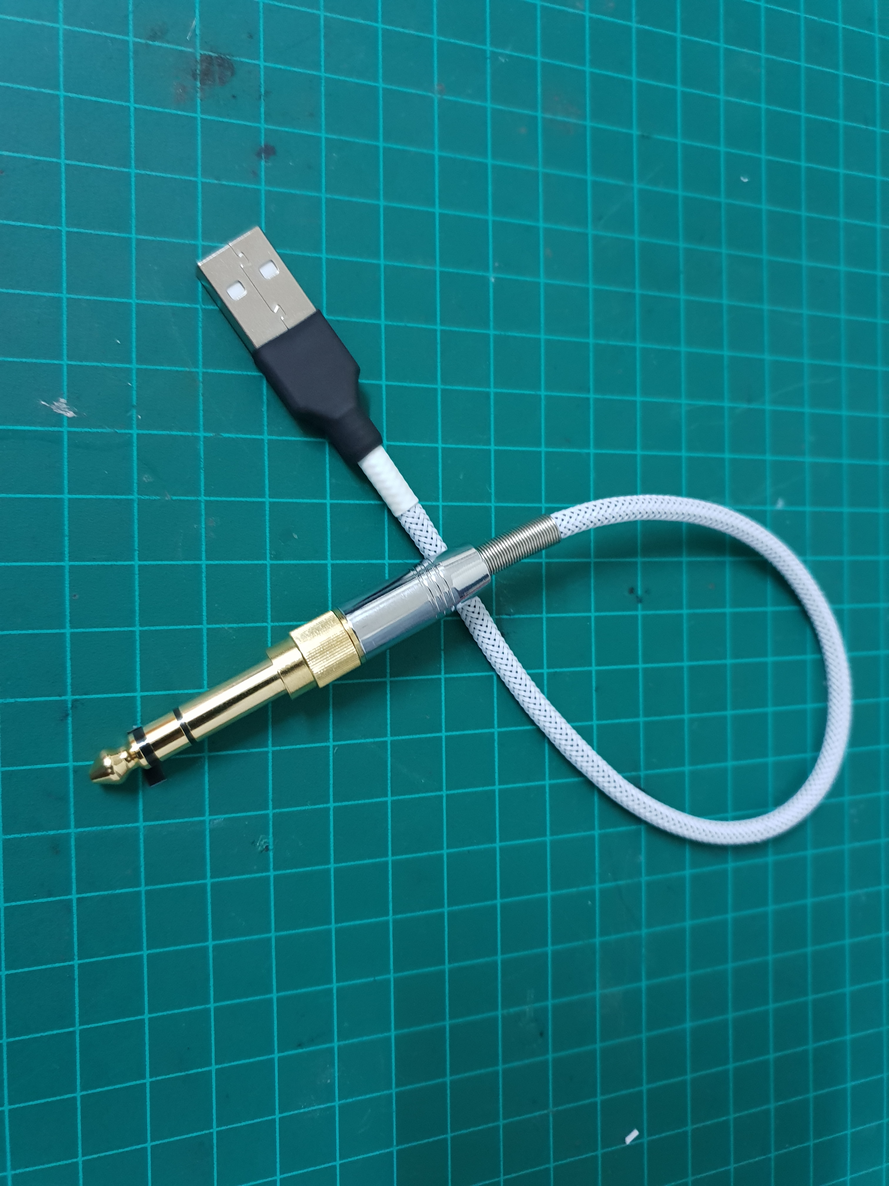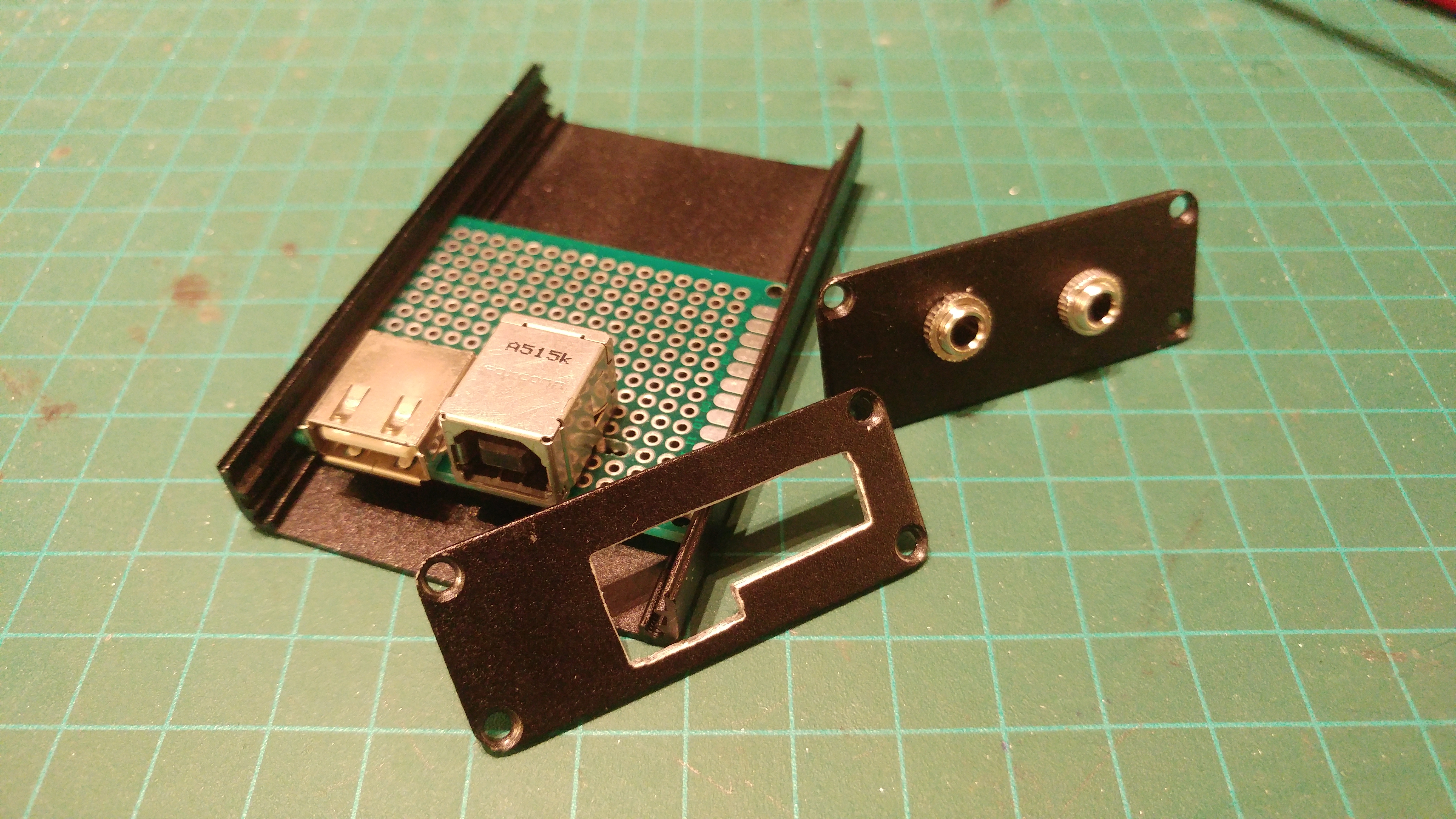 My audio interface is connected to the computer via USB. I didn't want to use another USB port just to power the adapter, so I figured I could have the circuit inline to the USB power as well as the audio signal.