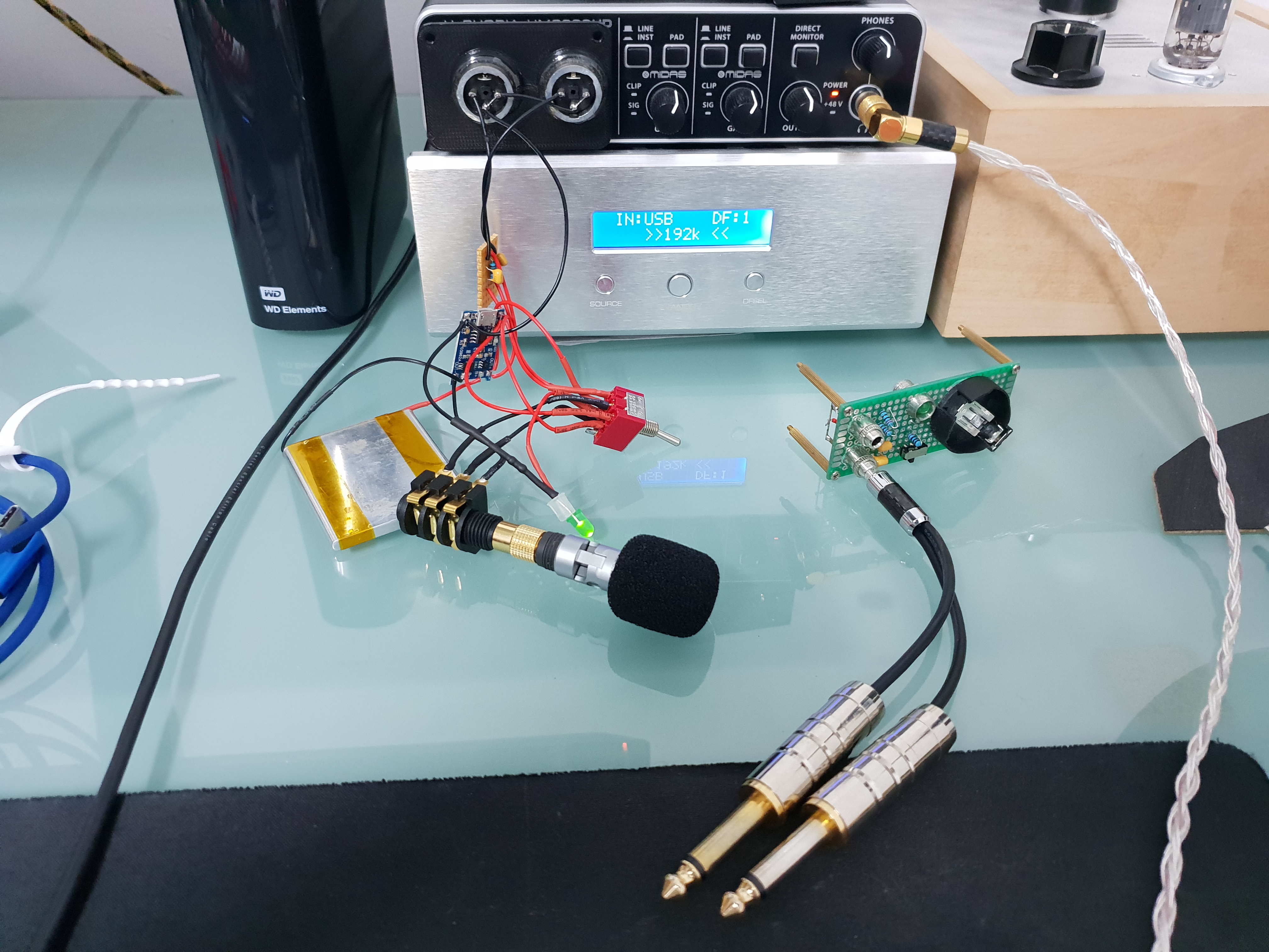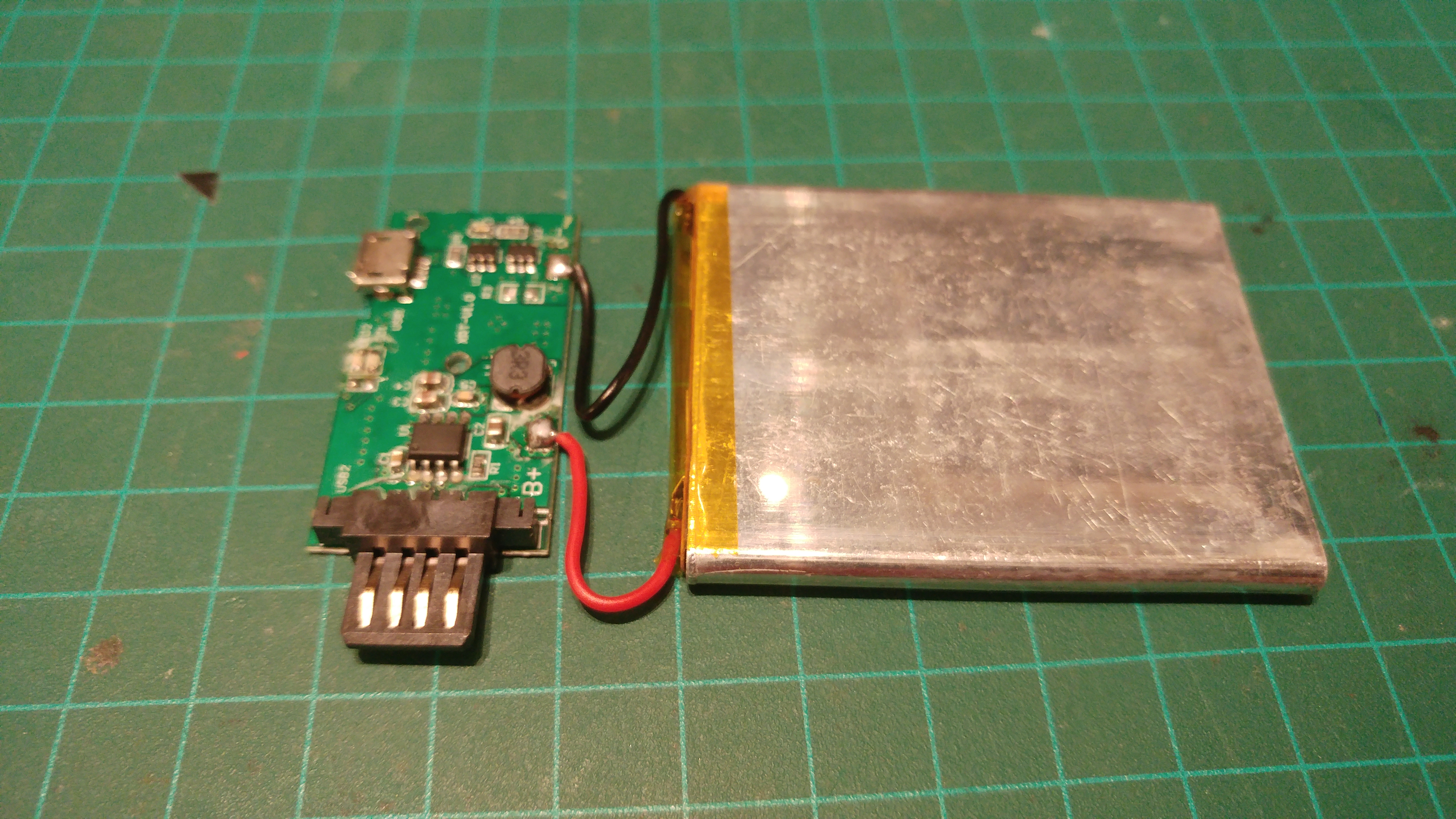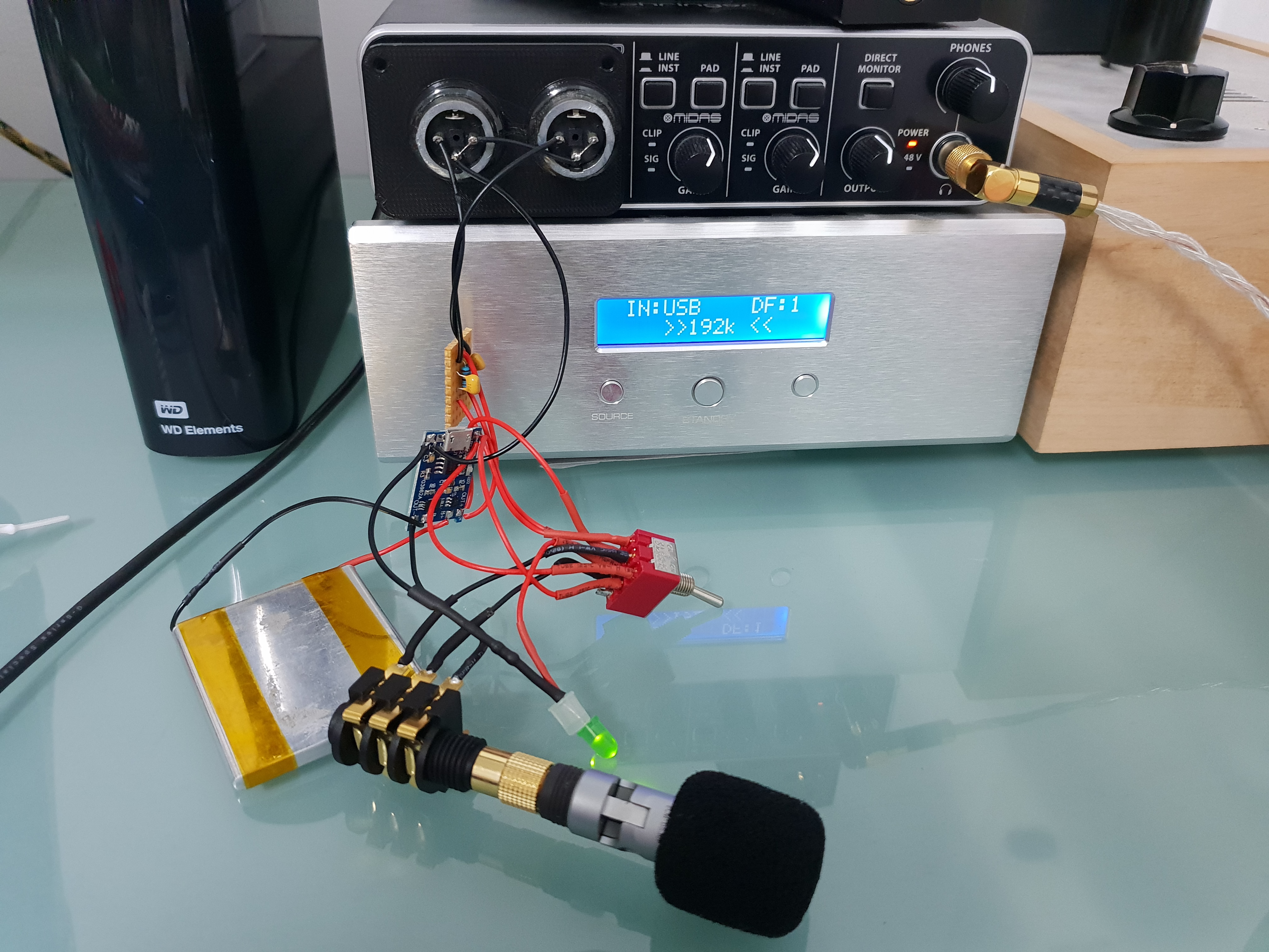 To test my noise theory, I replaced the USB power input with a battery. If the noise is coming from the power input and not the mic or circuit, the battery should eliminate it.