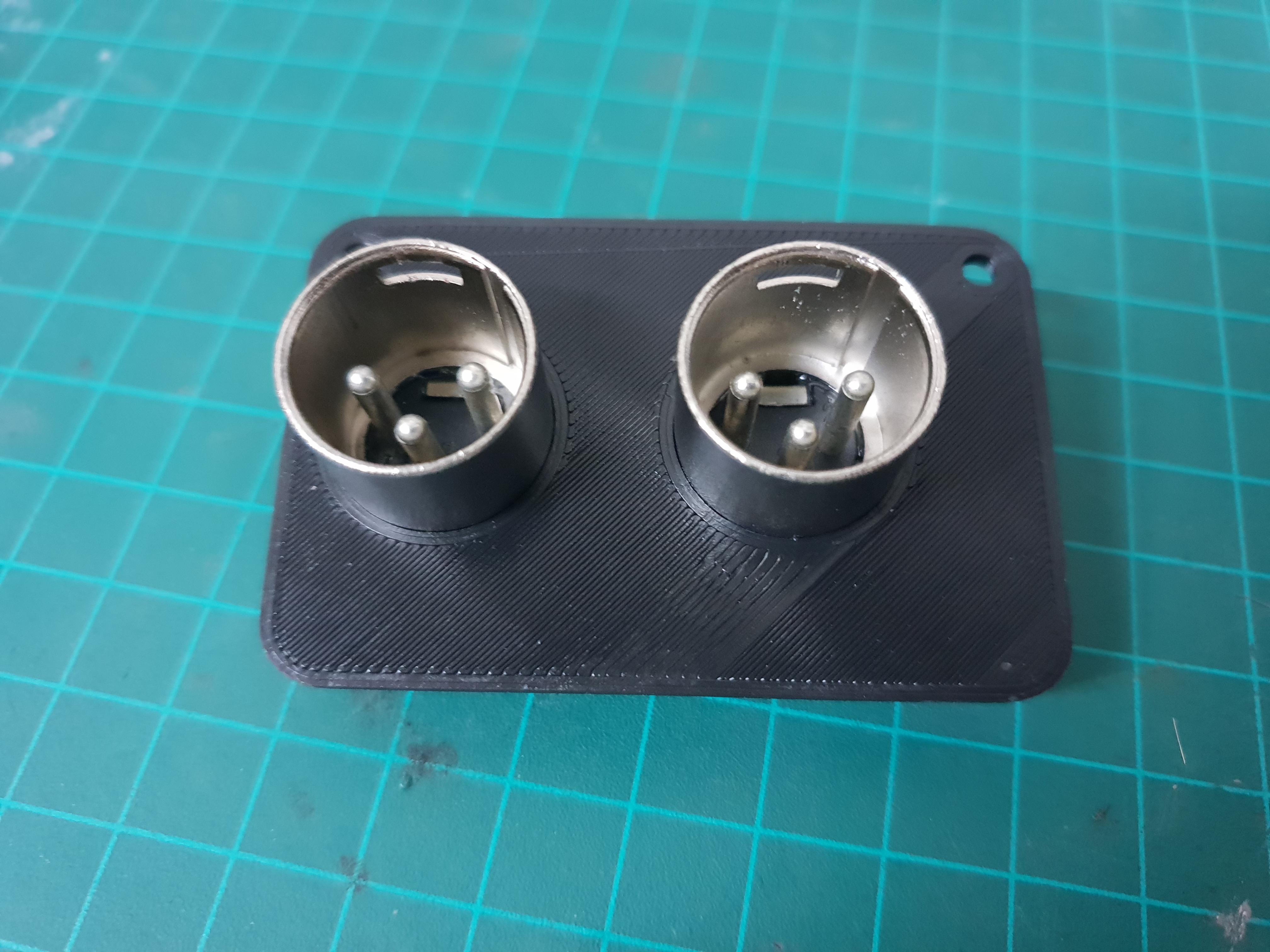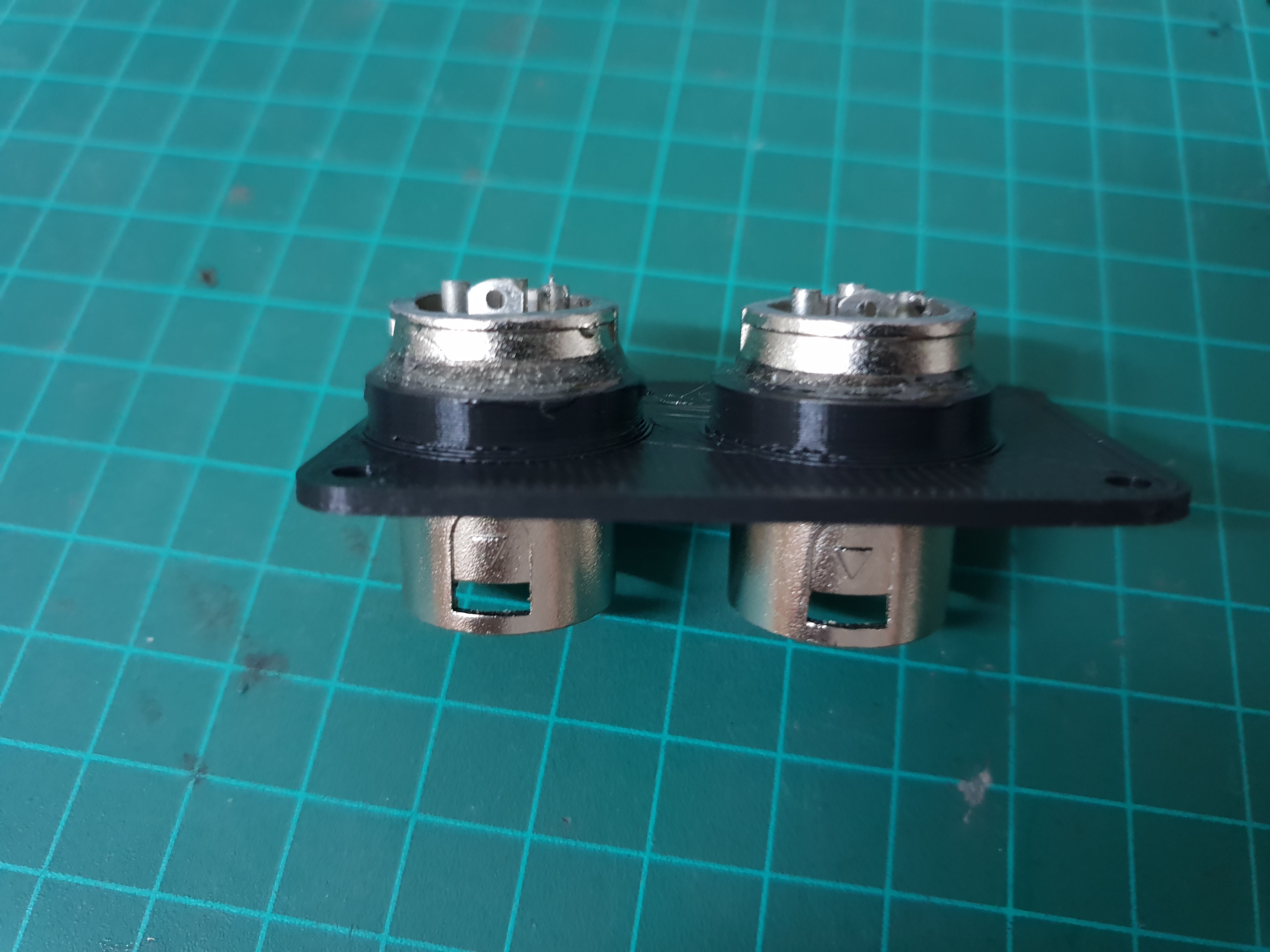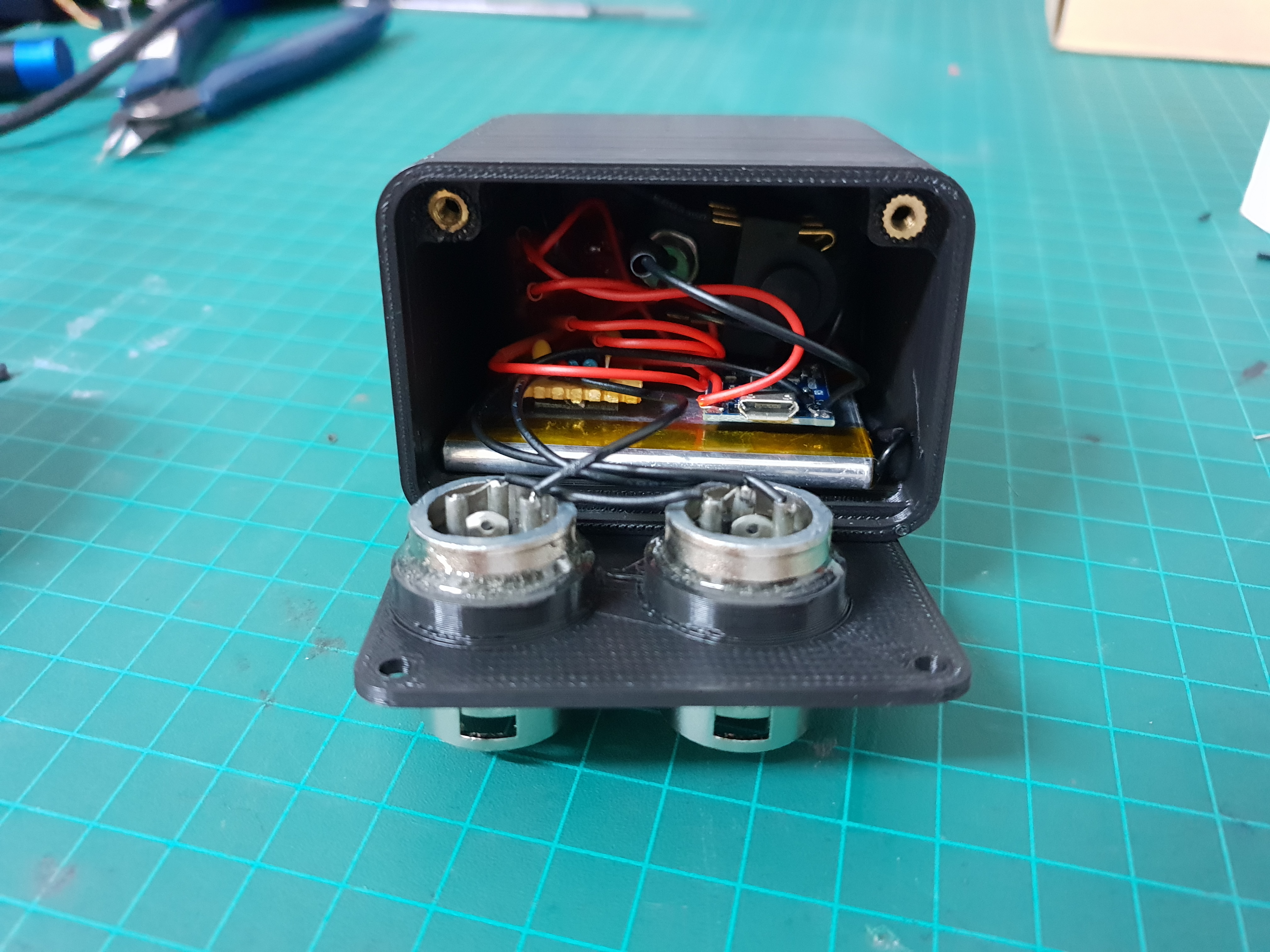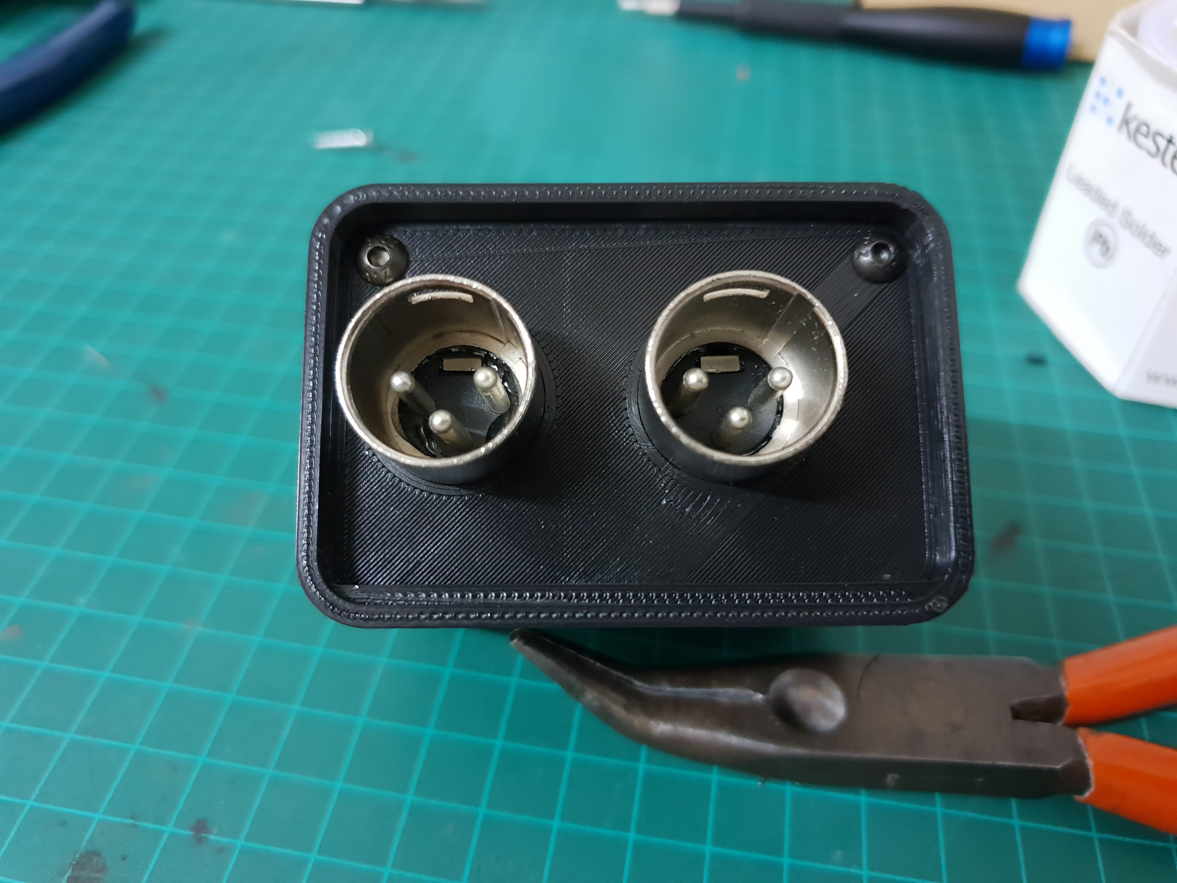 The XLR connectors were shortened with a saw to make room inside the box and are glued in place with epoxy.