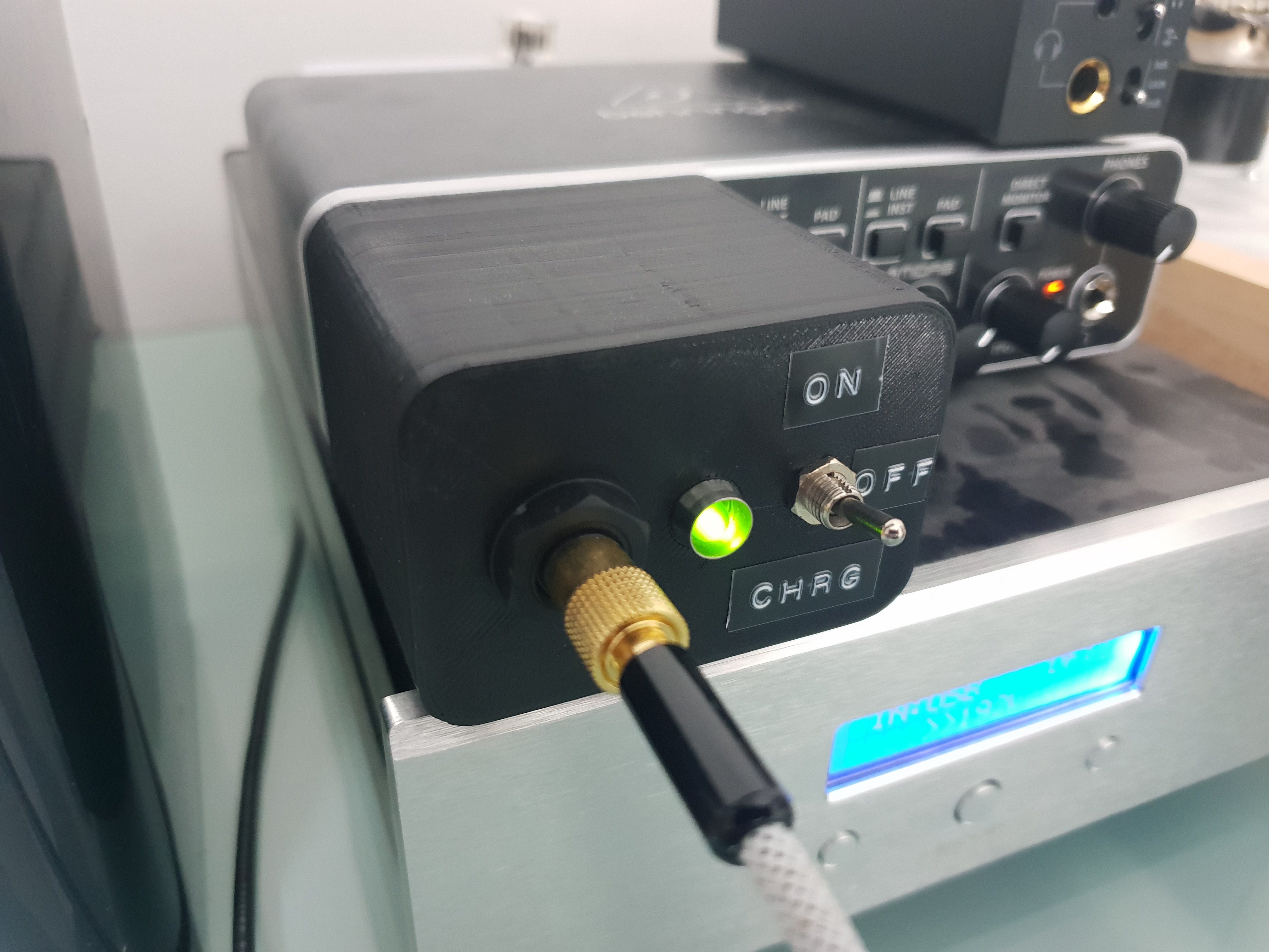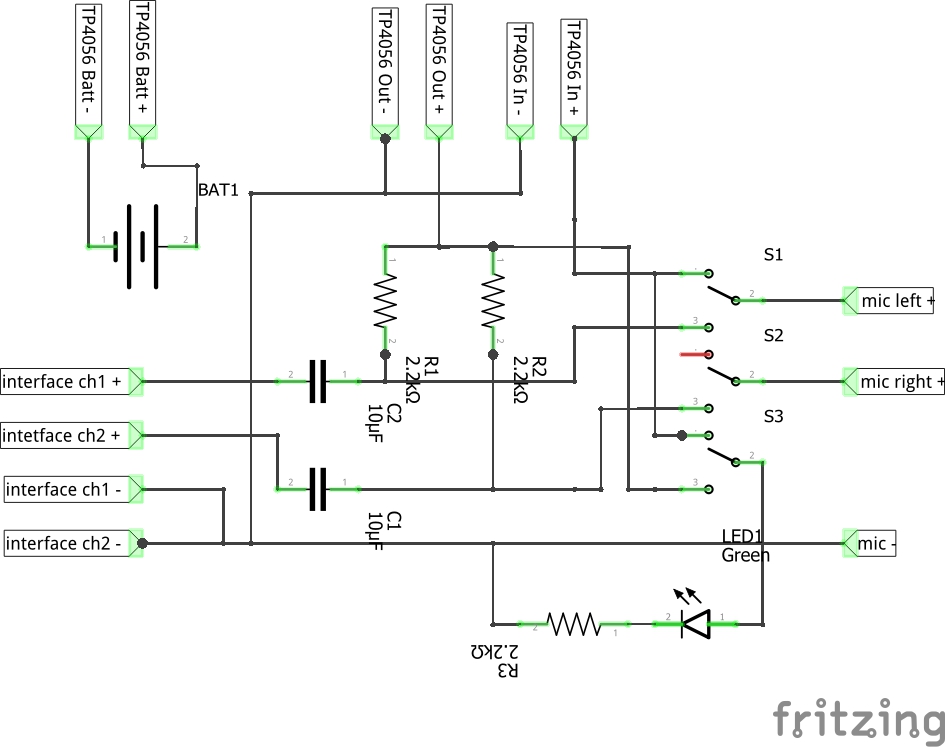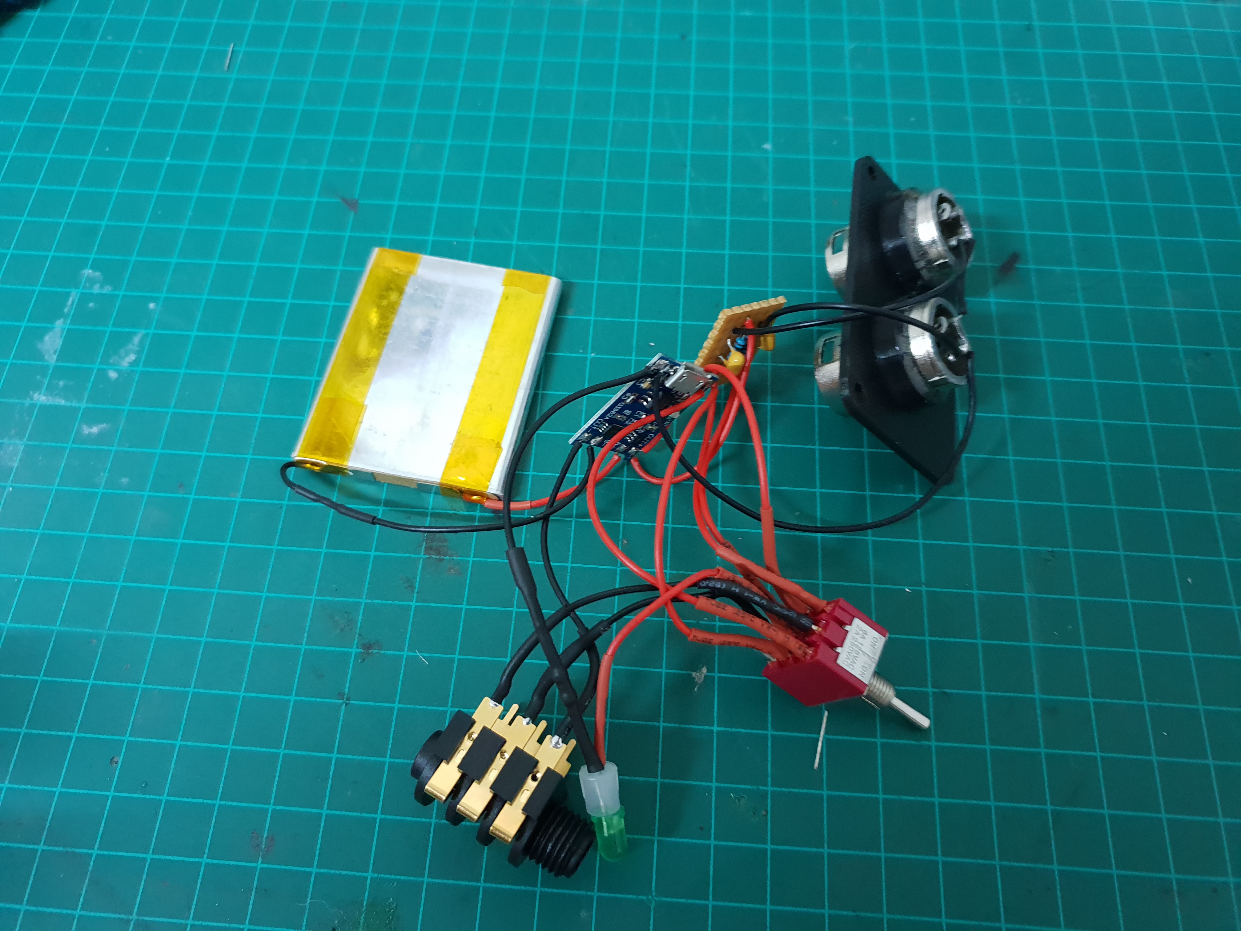 To save some space, I used the mic input as the charging port. There would be no point in charging and using the device simultaneously, as I will be charging it from a USB port on my computer, which will introduce the noise I wanted to avoid.