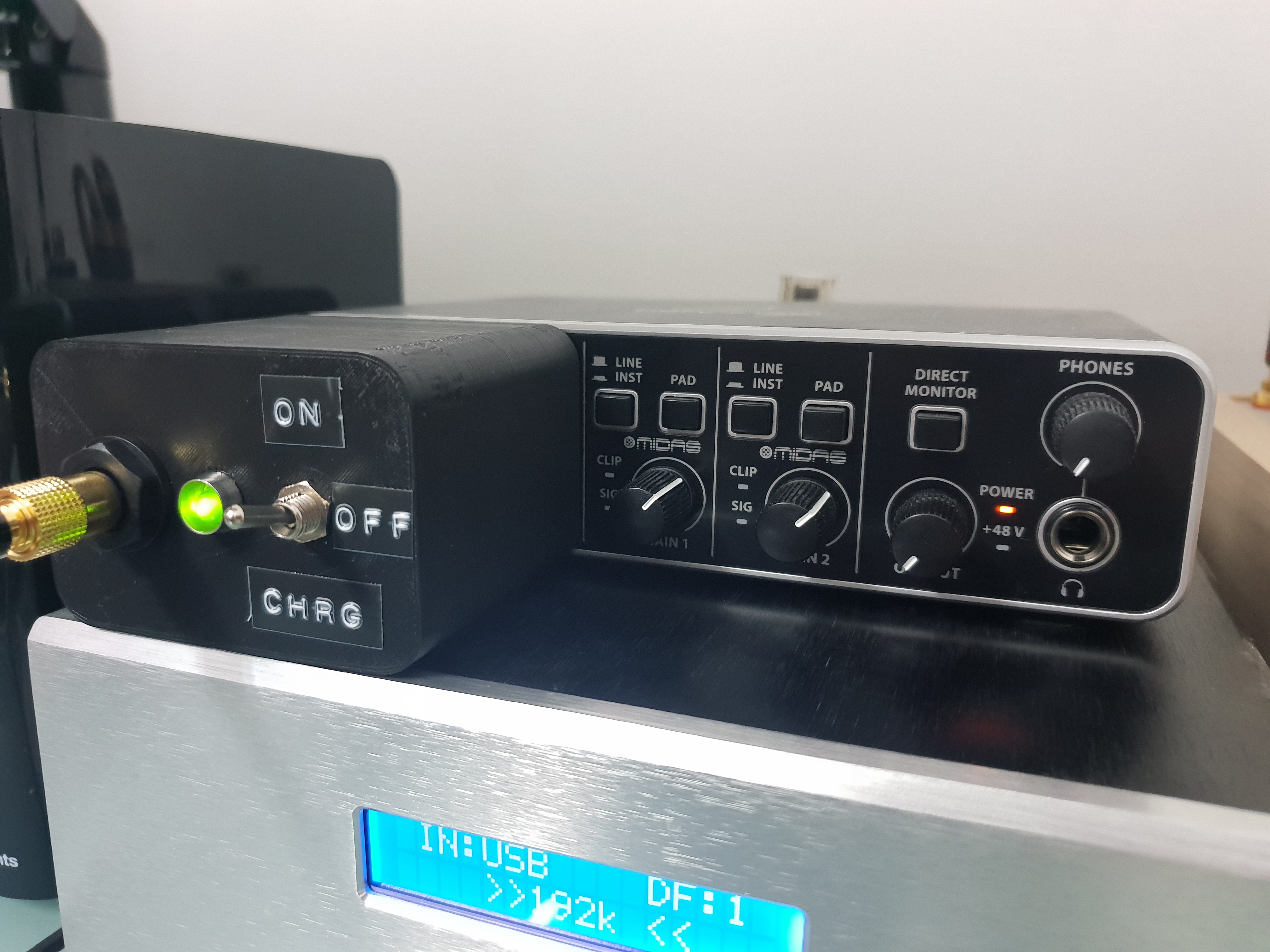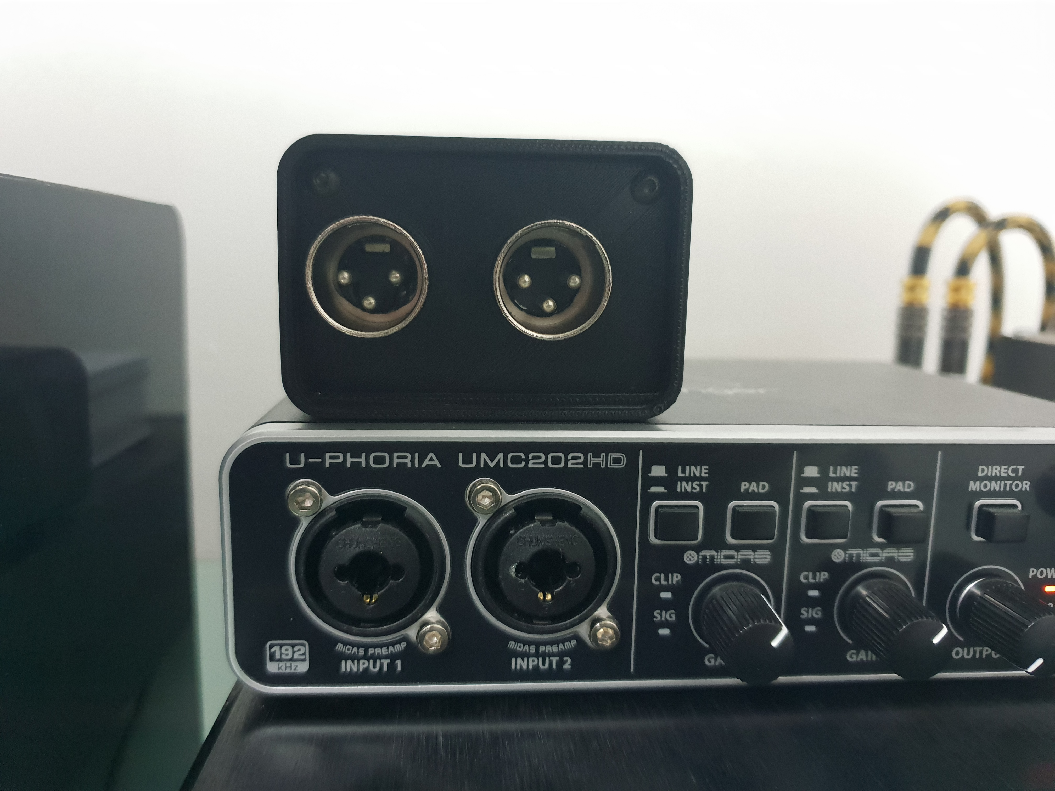 I wanted the device to be mounted to the audio interface and not be another dedicated box with bridging wires. I 3D printed a case that follows the shape of my audio interface and would be a kind of module that hooks up to it.