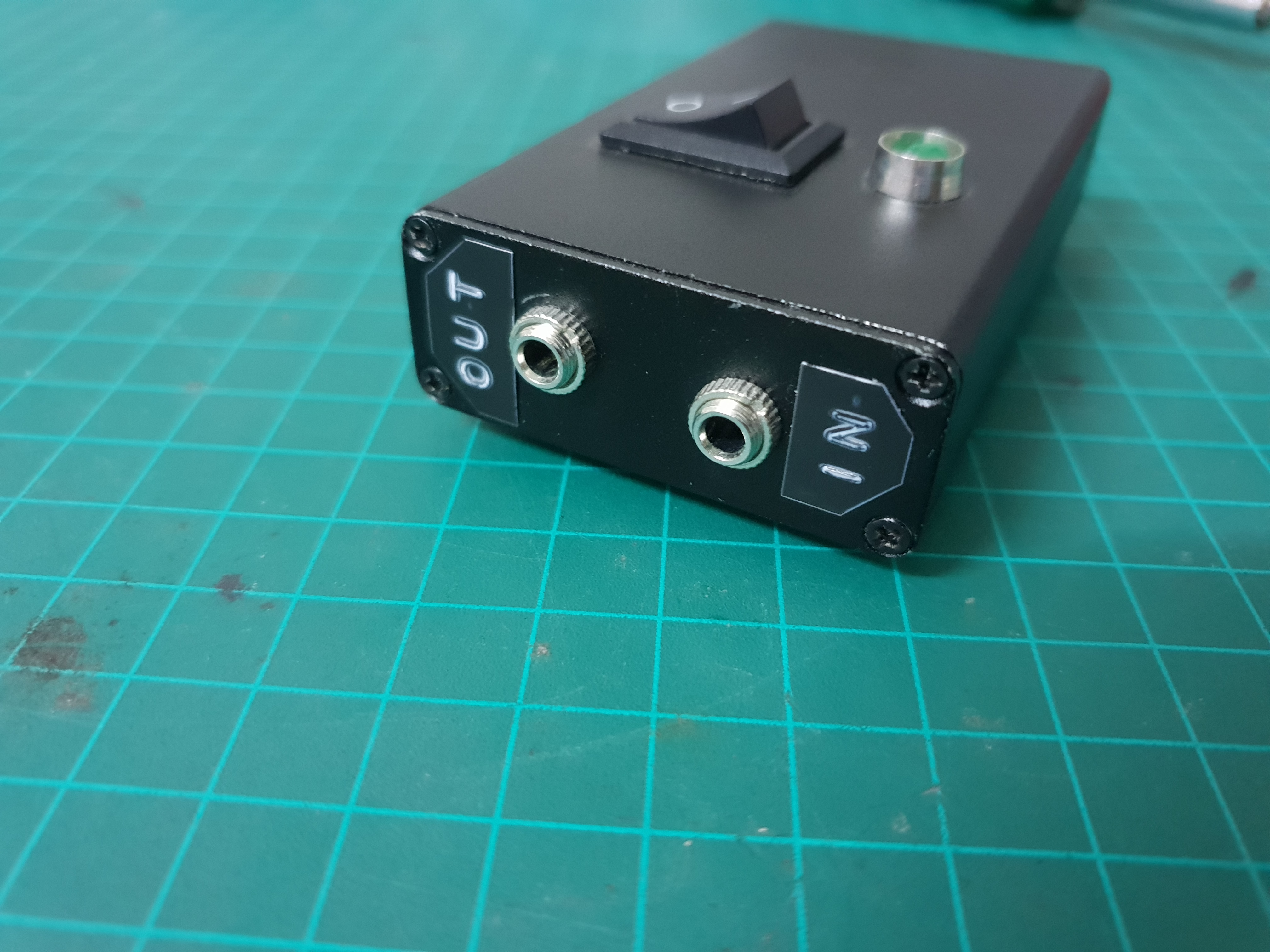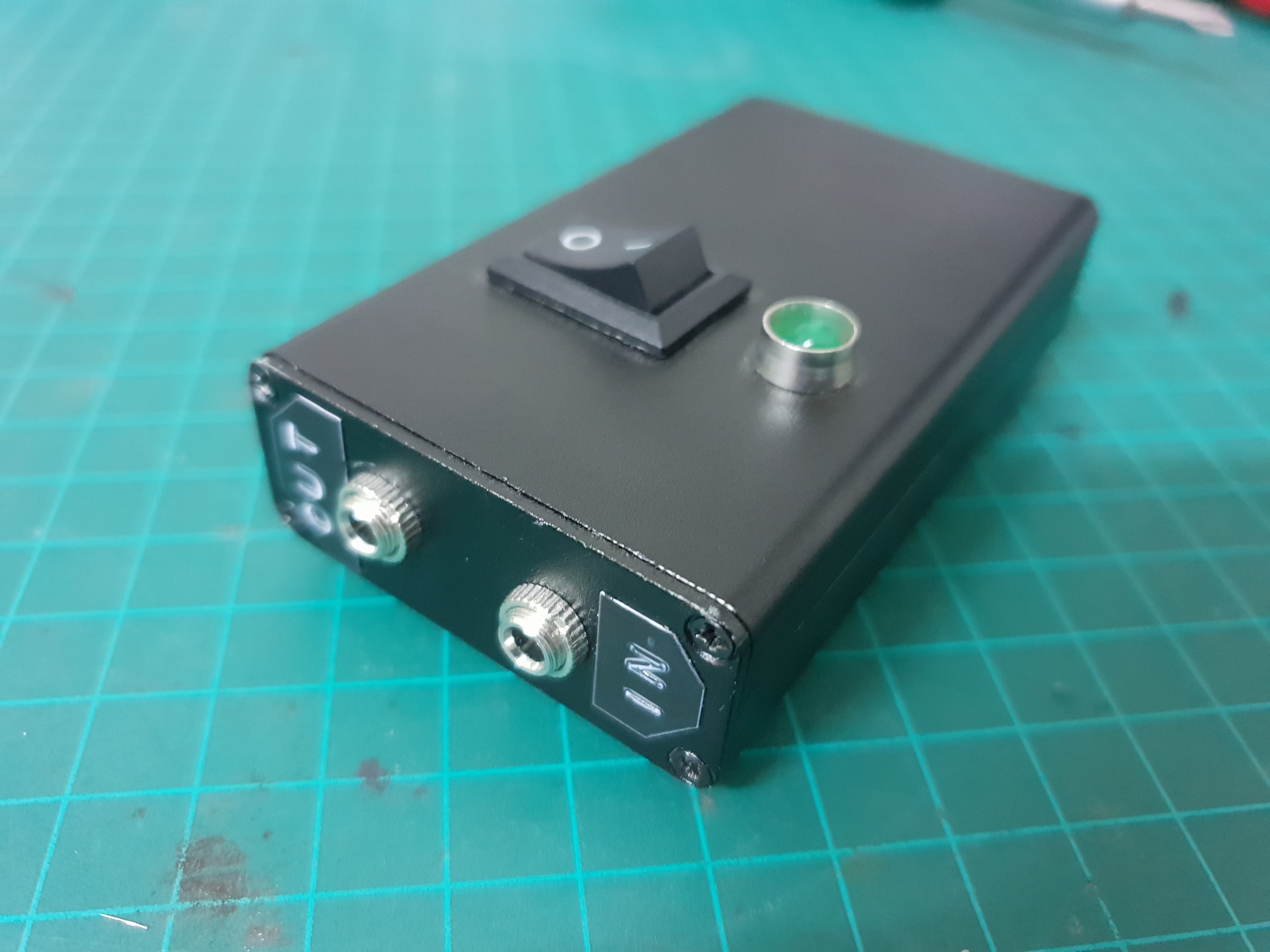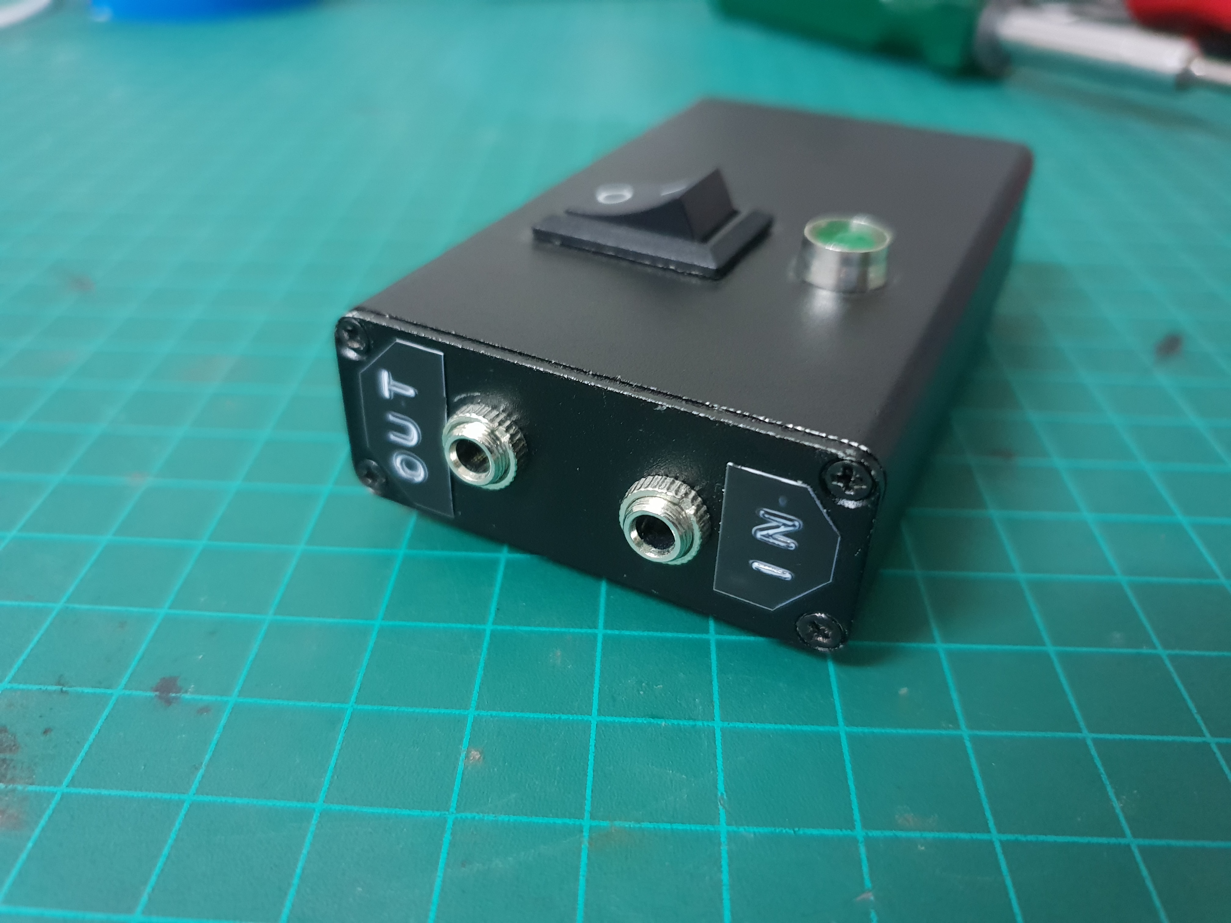 I added a switch and an indication LED, stereo 3.5mm jacks for the audio inputs and outputs and tested the circuit.