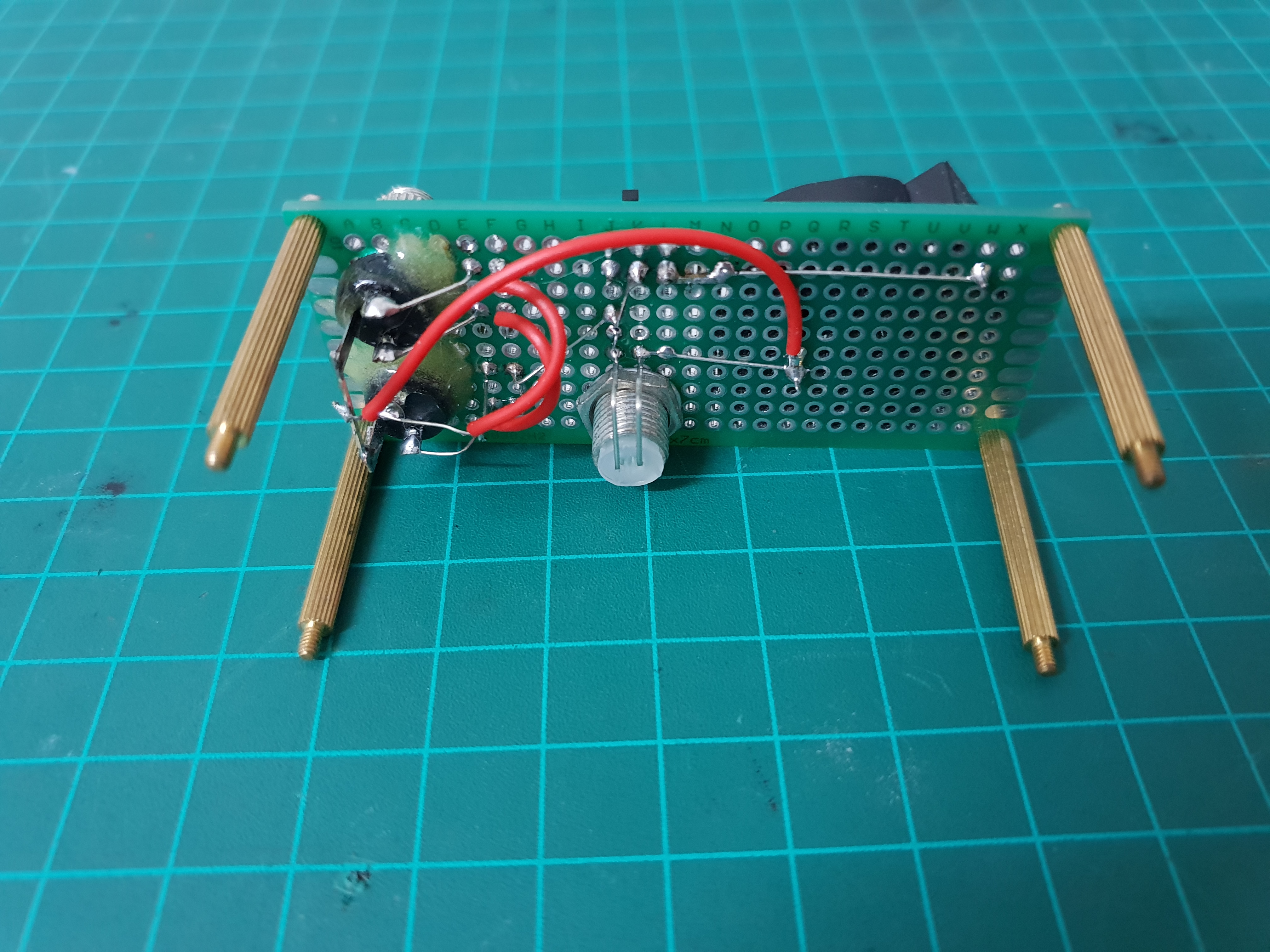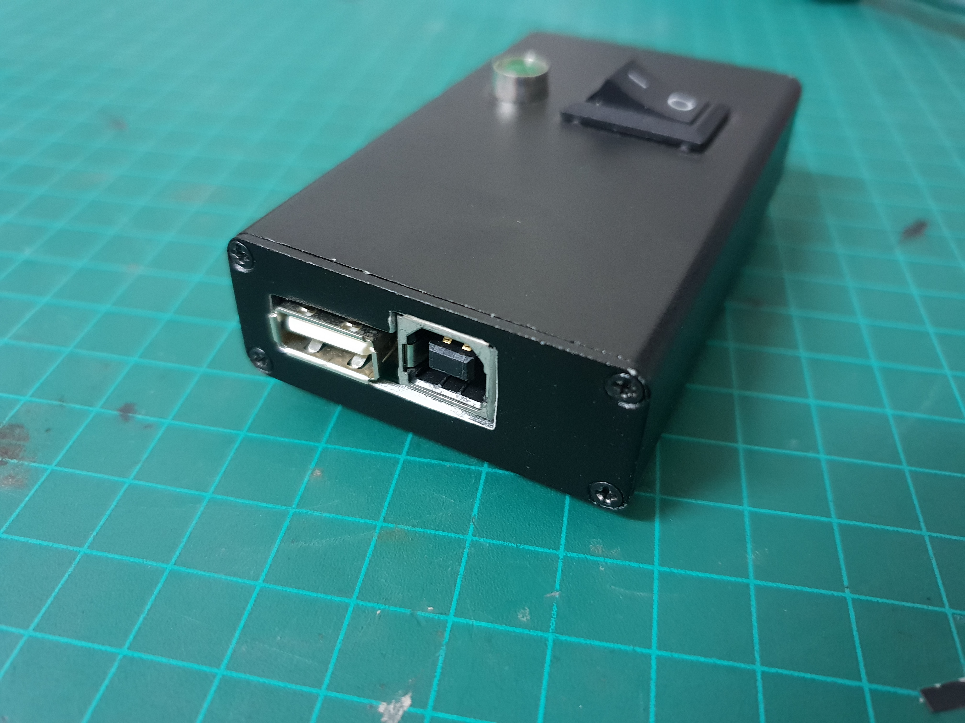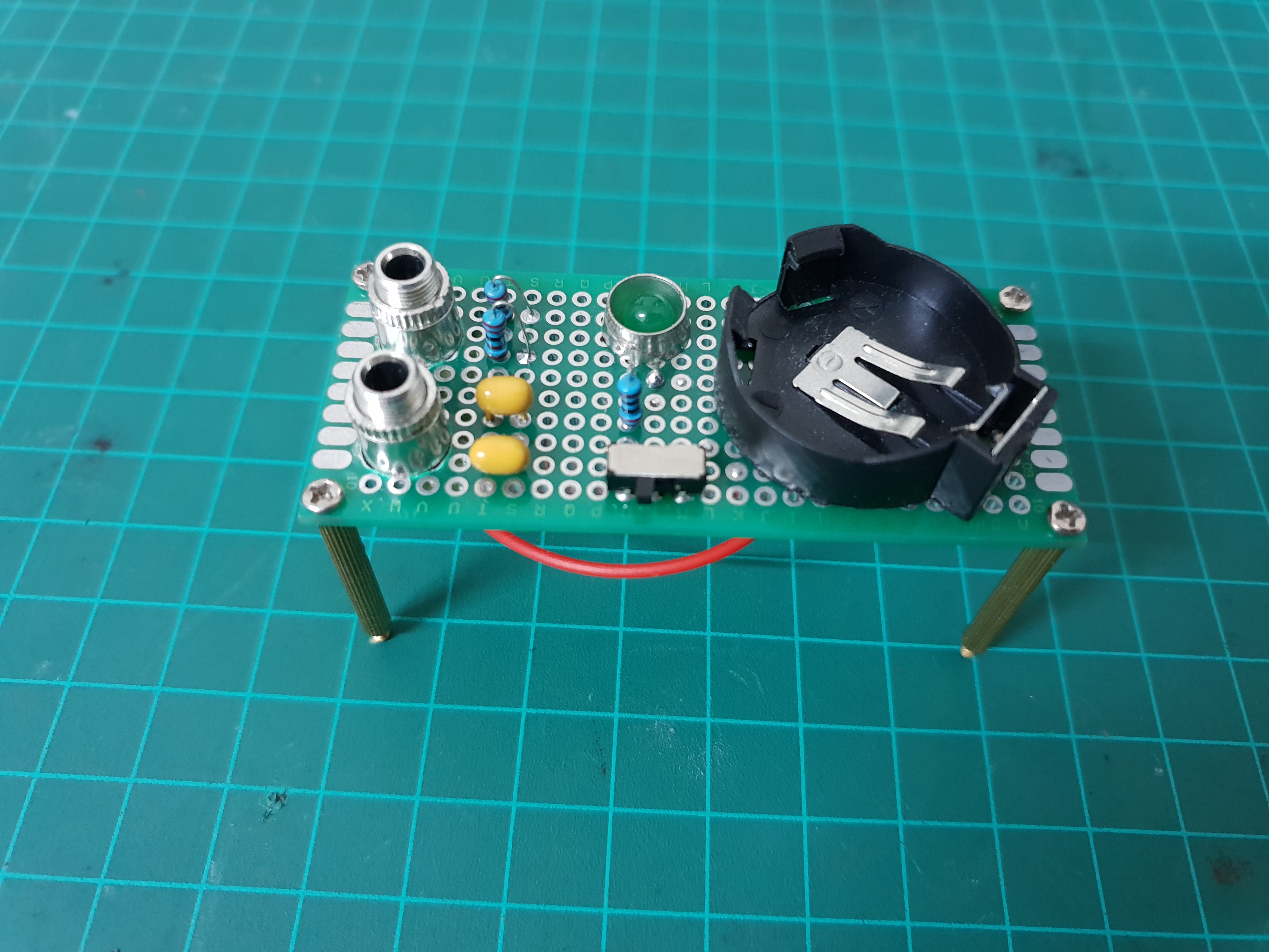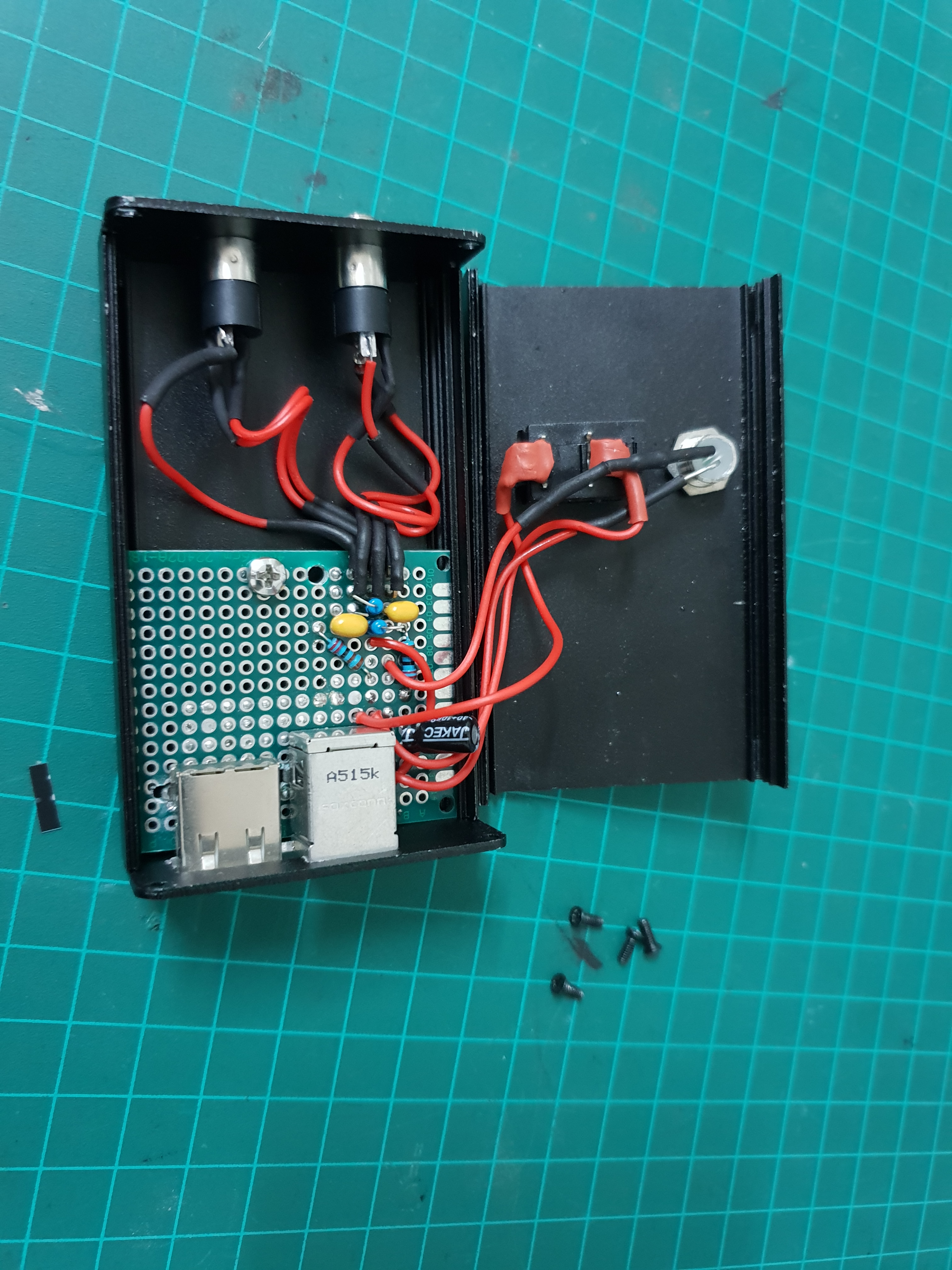 I added a switch and an indication LED, stereo 3.5mm jacks for the audio inputs and outputs and tested the circuit.