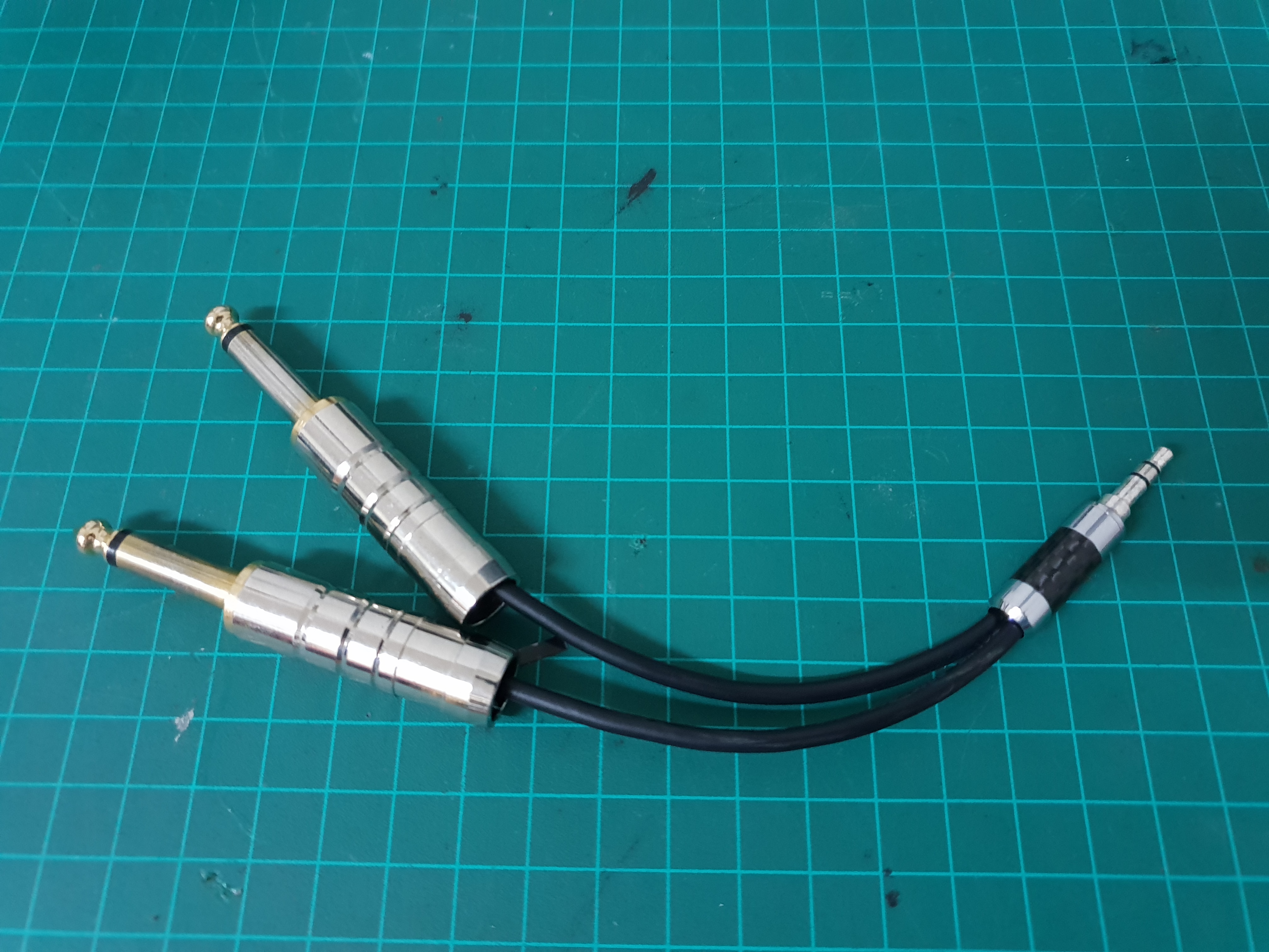 My interface has combo jacks that accept XLR and 6.35mm PL jacks. I made a small splitter cable from a stereo 3.5mm to dual mono 6.35mm connectors.