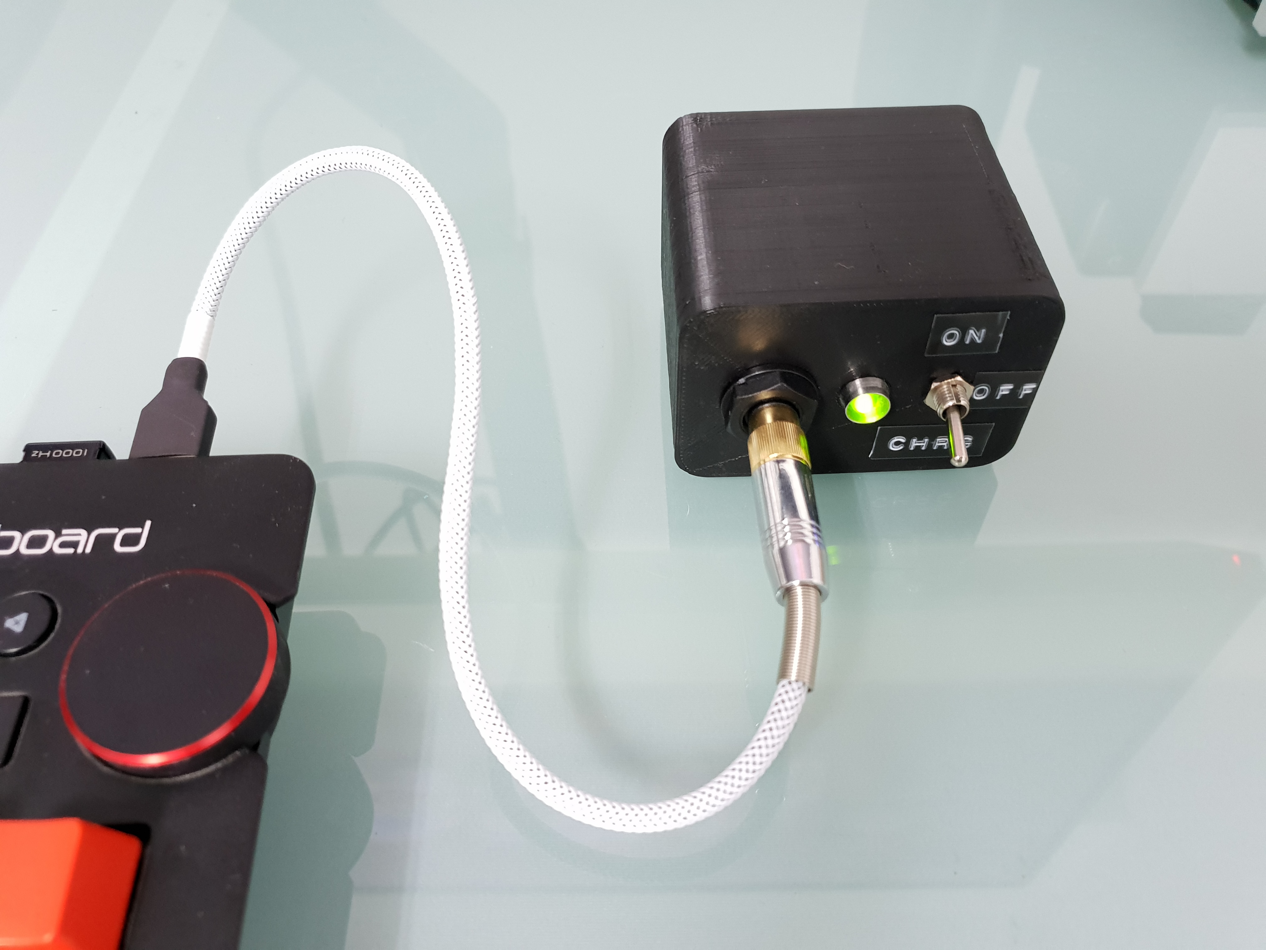 To charge the device, since the charging port is also the audio input, I came up with this unusual cable :