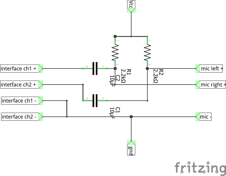 I tried adding a resistor between each of the outputs (after the capacitor) and ground, like shown in the sound blaster example in the article, but it made things worse and the signal from the mic would get lost.