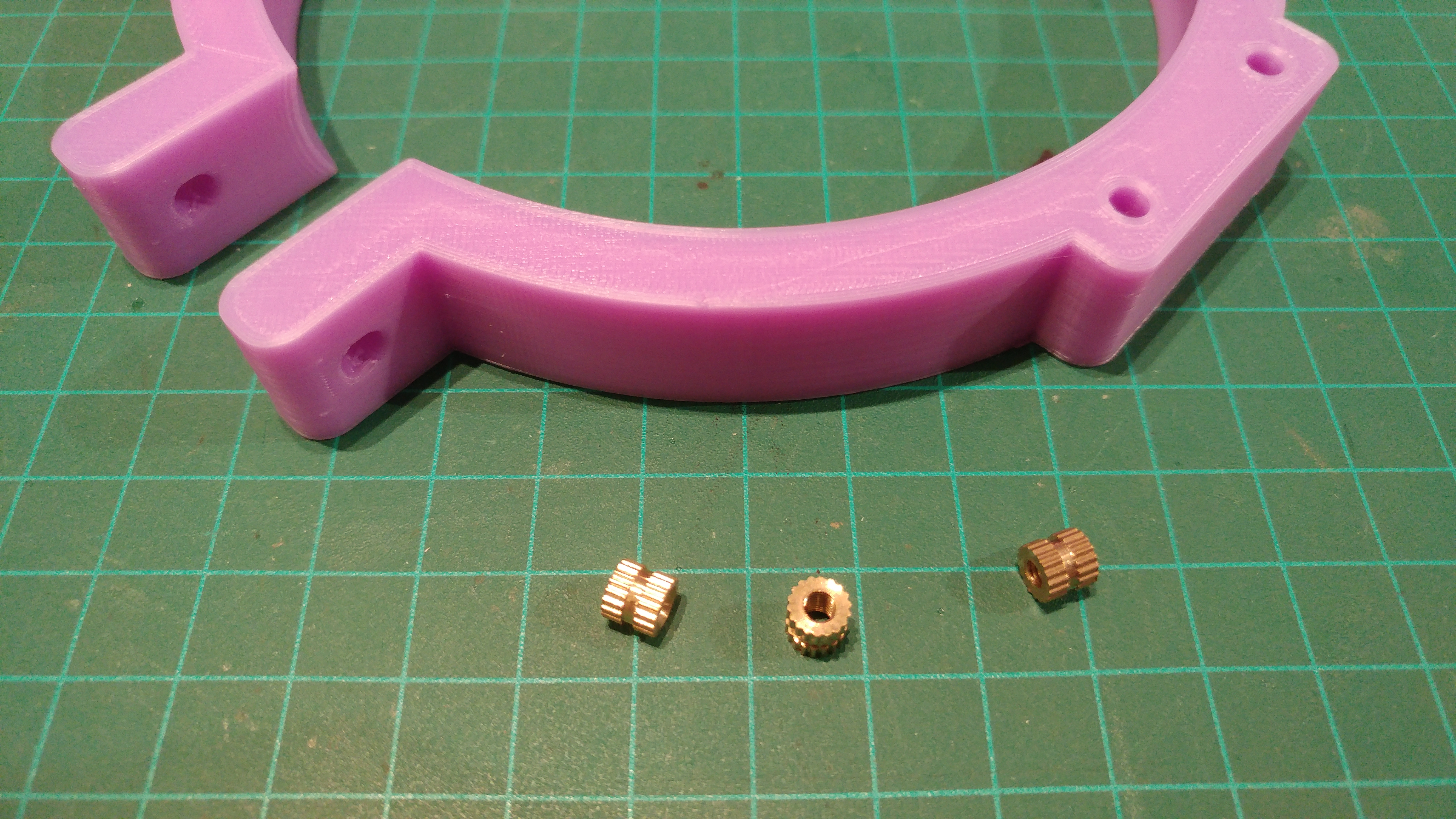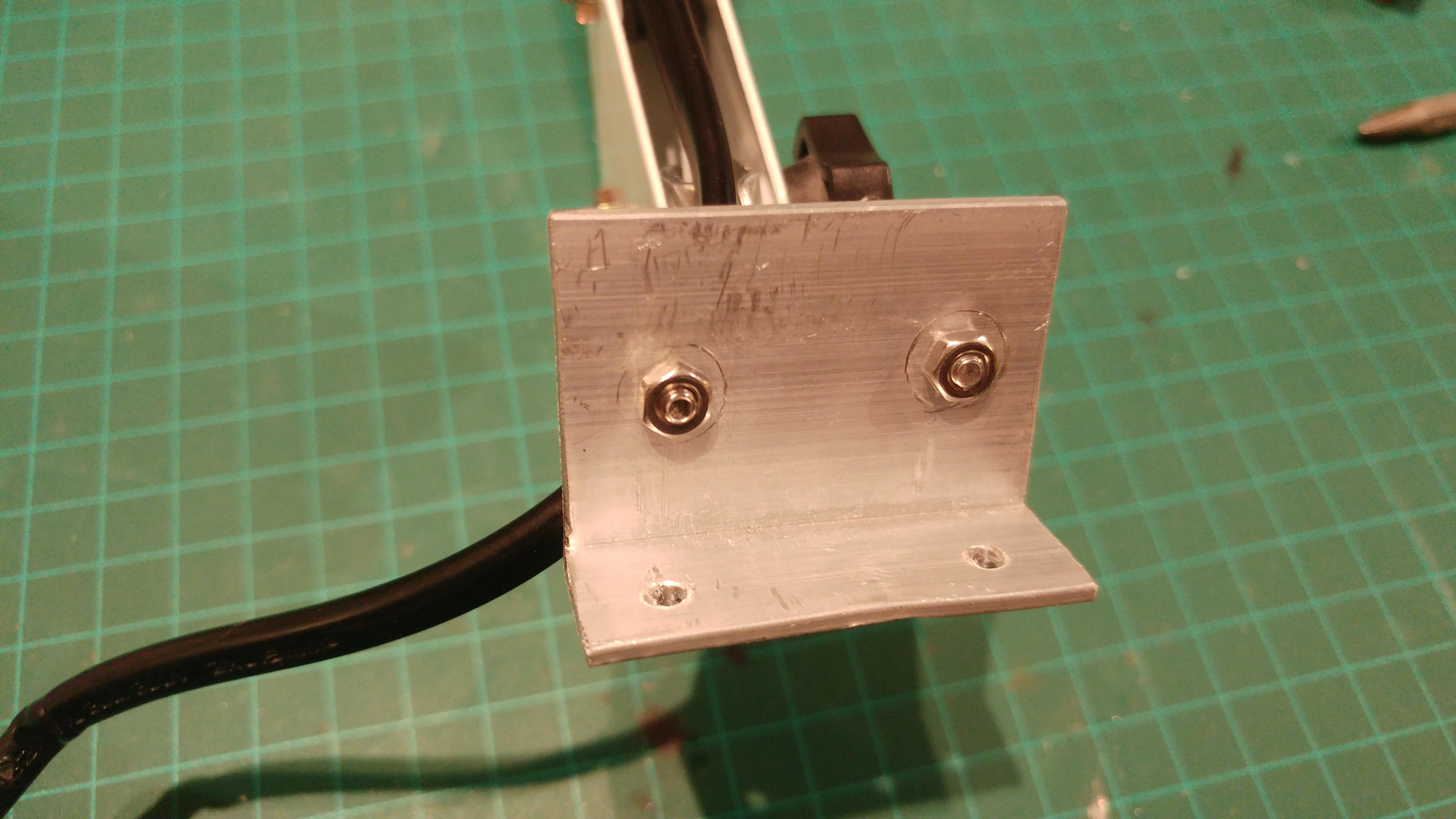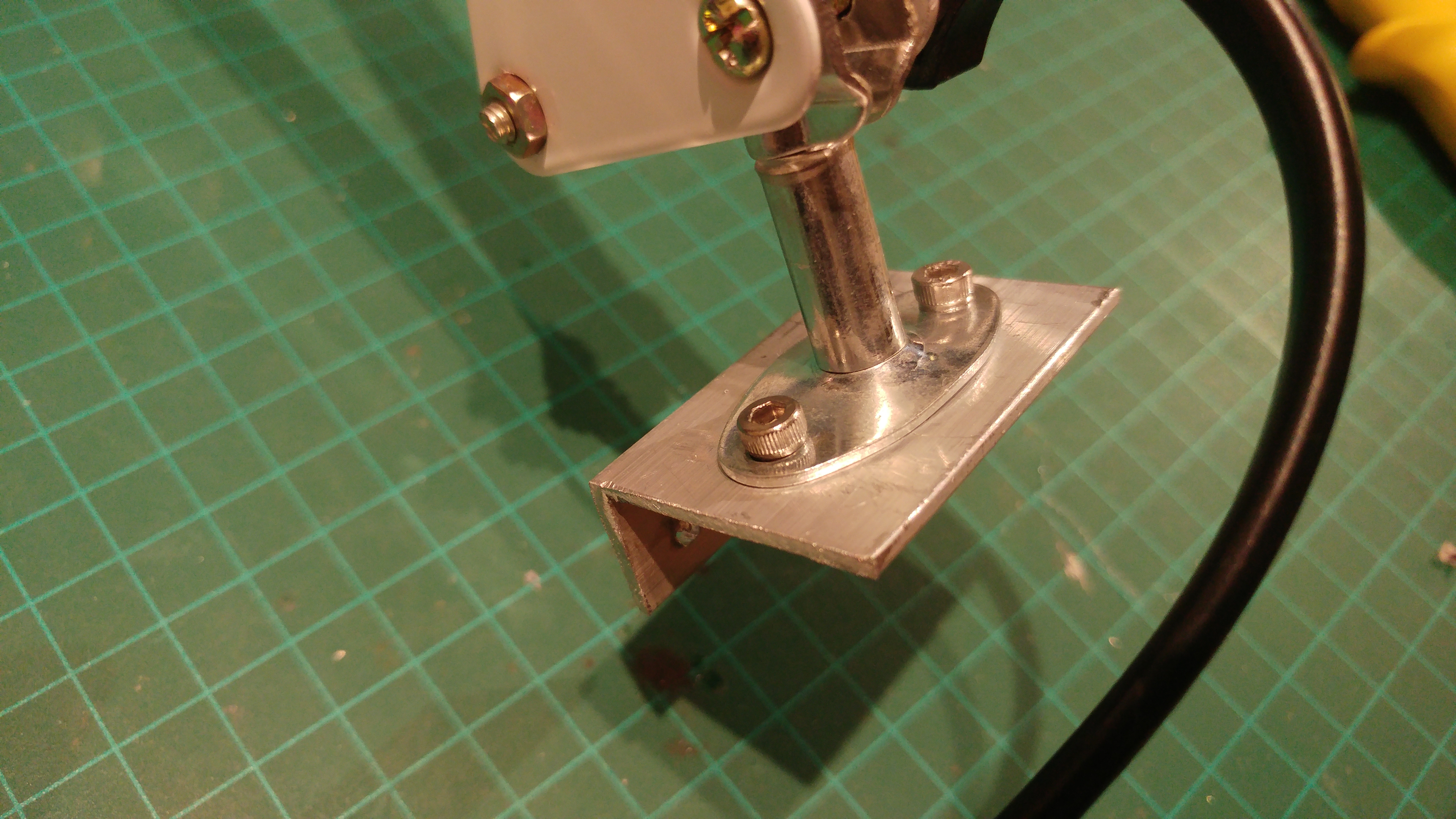 In order to mount the clamp to the arm, I drilled some holes in a piece of angled aluminium to fit the original rotating mount and the clamp.The printed part was fitted with 5mmX5mm M3 knurled nuts that were installed using a soldering iron.